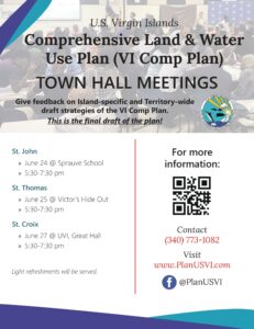 “We will be presenting the heart of the VI Comprehensive Land and Water Use Plan during the upcoming series of Town Halls, in which we seek feedback from the community,” Commissioner Oriol explained. Before finalizing the plan, DPNR is hosting the fourth and final round of Town Halls to consider and include public comment in the creation of the CLWUP. Commissioner Oriol stressed, “This will be the last series of in-person town halls before the final VI Comprehensive Land and Water Use Plan is submitted to the Legislature for adoption.”