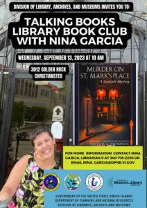 Commissioner Jean-Pierre L. Oriol of the Department of Planning and Natural Resources announces the Talking Books library will host BOOK CLUB WITH NINA GARCIA on Wednesday, September 13th at 10 a.m. at the Regional Library for the Blind and Physically Challenged in Christiansted. This month’s book club selection is Murder on St. Mark’s Place from Victoria Thompson.