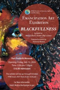 The BLACKFULLNESS exhibit will open at the Fort Frederik Museum on Friday, July 12th from 5:30pm-7:30pm. Admission is $10 per person, students 17 and under are free. Additional free viewing on Saturday, July 13 from 1:00pm – 4:00pm. The show will be up through October during normal Fort Frederik Museum hours: M-F from 9-4:30pm.