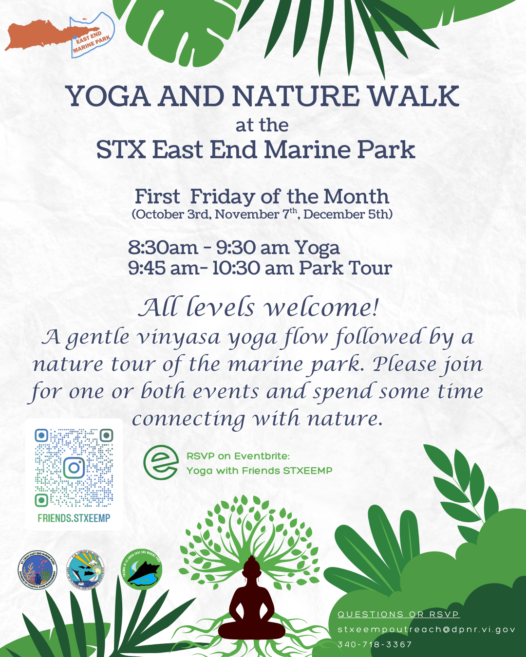 Commissioner Jean-Pierre L. Oriol of the Department of Planning and Natural Resources is pleased to announce that the Division of Coastal Zone Management, in partnership with Friends of the St. Croix East End Marine Park, will host a special outdoor event: Yoga and Nature Walk, taking place on Friday, October 3rd at Estate Great Pond Park (formerly Camp Arawak).