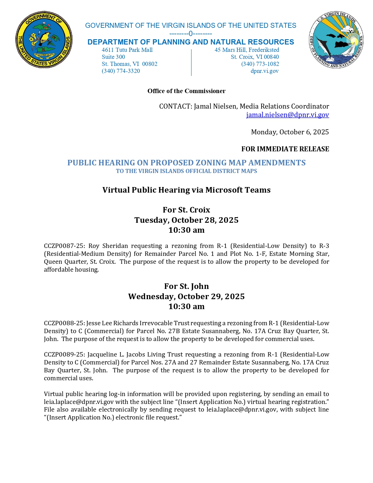 PUBLIC HEARING ON PROPOSED ZONING MAP AMENDMENTS TO THE VIRGIN ISLANDS OFFICIAL DISTRICT MAPS