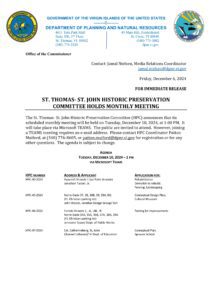 The St. Thomas- St. John Historic Preservation Committee (HPC) announces that its scheduled monthly meeting will be held on Tuesday, December 10, 2024, at 1:00 PM. It will take place via Microsoft TEAMS. The public are invited to attend. However, joining a TEAMS meeting requires an e-mail address. Please contact HPC Coordinator Patton Mulford, at (340) 776-8605, or patton.mulford@dpnr.vi.gov for registration or for any other questions. The agenda is subject to change.