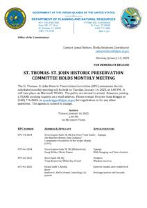 The St. Thomas- St. John Historic Preservation Committee (HPC) announces that its scheduled monthly meeting will be held on Tuesday, January 14, 2025, at 1:00 PM. It will take place via Microsoft TEAMS. The public are invited to attend. However, joining a TEAMS meeting requires an e-mail address. Please contact Director Sean Krigger at (340) 776-8605, or sean.krigger@dpnr.vi.gov for registration or for any other questions. The agenda is subject to change.