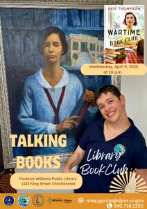 Commissioner Jean-Pierre L. Oriol of the Department of Planning and Natural Resources announces the Talking Books Library will host Book Club with Nina Garcia on Wednesday, April 9th, at 10 a.m. at the Regional Library for the Blind and Physically Challenged, which is now located in Florence Williams Public Library in Christiansted. This month’s book club selection is The Wartime Book Club by Kate Thompson.